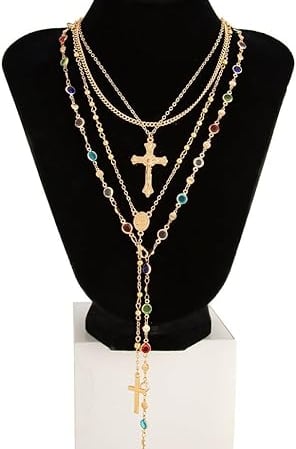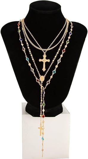 Gold Color Cross Pendant Necklace Set for Women,Dainty Big Crystal Cross Imitation pearl Layered Chain Necklace Summer Party Jewelry
