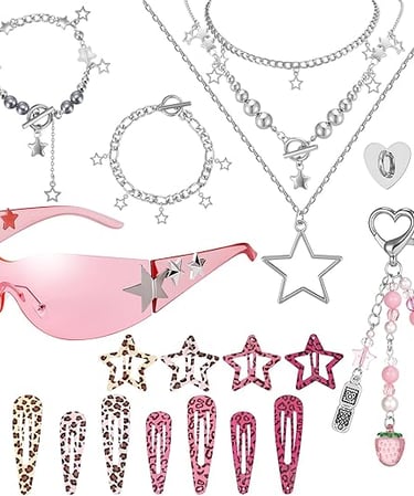 Y2k Accessories Set Included Star Y2k Silver Necklace Grunge Layered Necklace Y2K Sunglasses Star Hair Clip Y2k Silver Hair Clips Keychain Hip Hop Pants Chain Vintage Jewelry Set for Women