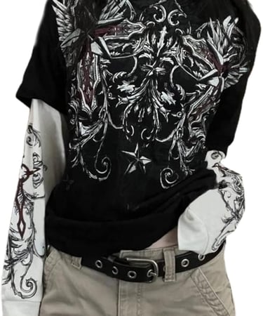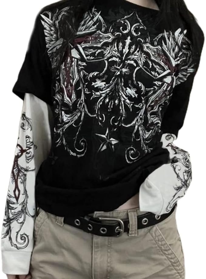Y2k Fairy Grunge Graphic Long Sleeve Tees Tops Women E-Girls Aesthetic Gothic Skull Print Baggy T Shirts Emo Clothes