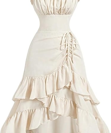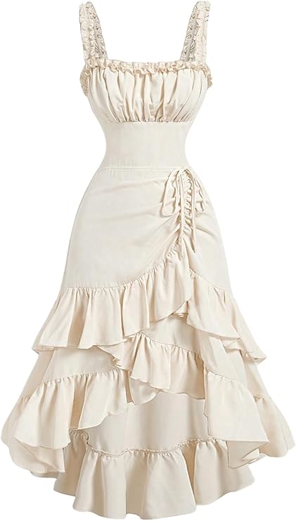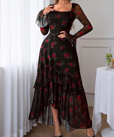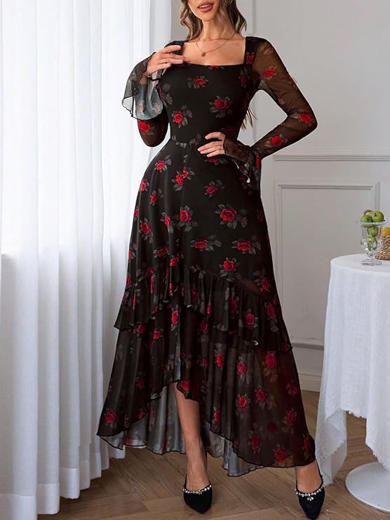 GothDark Women's Floral Mesh Dress Elegant Long Sleeve Square Neck Double Layer Ruffle Hem Casual