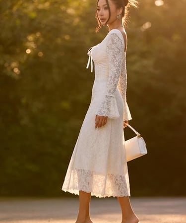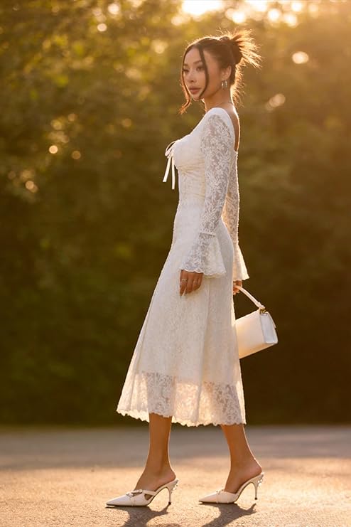 Floral Lace Midi Dress for Women Square Neck Long Sleeve A Line Mesh Party Formal Outfit