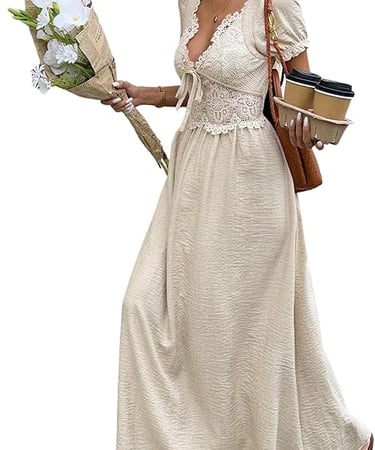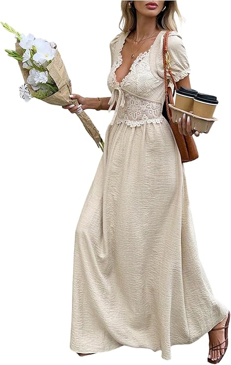 Women's Lace Deep V Neck Puff Short Sleeve Tie Bow Backless A Line Flowy Maxi Dress