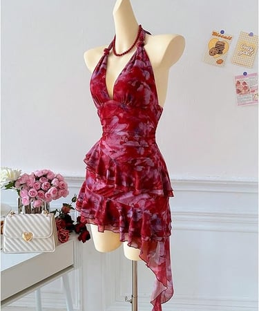 Verdusa Women's Summer Dress Y2k Halter Mini Dress Mesh Backless Dress Floral Ruffle Dress Wedding Guest Dress