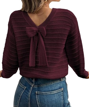 Sweaters for Women Long Sleeve Fall Outfits 2025 Back Bow Knot Sweaters Round Neck Solid Knit Pullover Tops