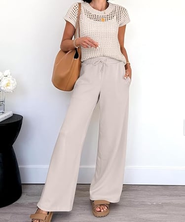 Women Two Piece Outfits Crochet Sheer Knit Sweater Top Wide Leg Pants Lounge Matching Sets Sweatsuit Travel Clothes
