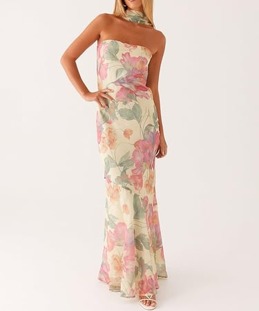 Women Strapless Floral Dress with Sarf Mesh Tube Maxi Dress Summer Cocktail Wedding Guest