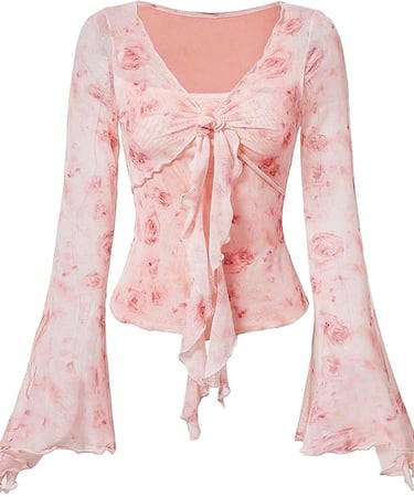 Cute Bell Sleeve Tops Floral Print Mesh Summer Long Sleeve Going Out Tops 2000s Clothing