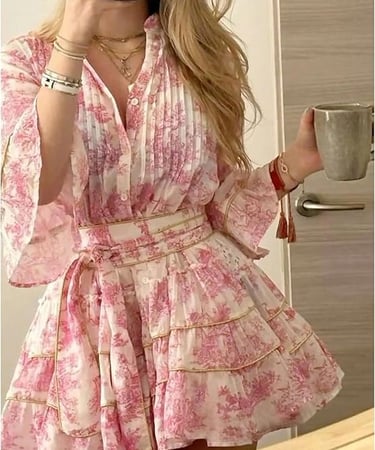 Women's Floral Ruffle Mini Dress V Neck 3/4 Sleeve Flowy Boho Vacation Dresses