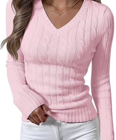Womens Long Sleeve Cable Knit Sweater 2025 Fall Fashion V Neck Fitted Pullover Top Business Casual Work Fall Outfits
