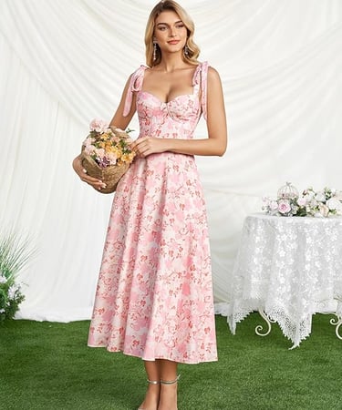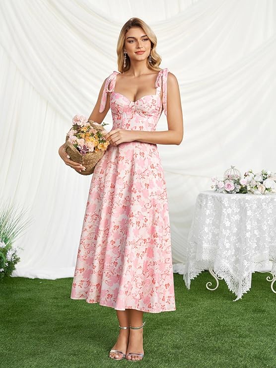 Floral Corset Midi Dress Tie Shoulder Flowy Summer Sundress with Pockets