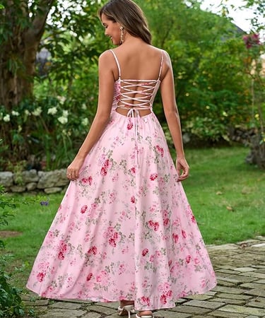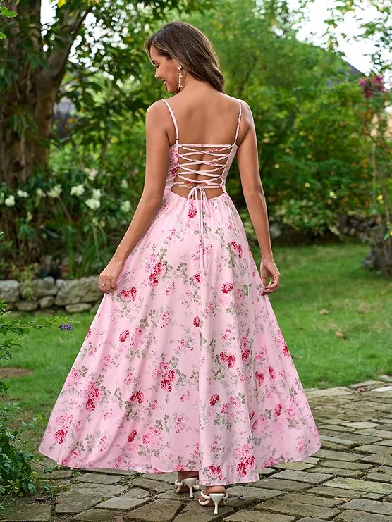 Summer Floral Maxi Dress Boho Spaghetti Strap Lace Up V Neck Flowy A Line Beach Vacation Long Dresses for Women