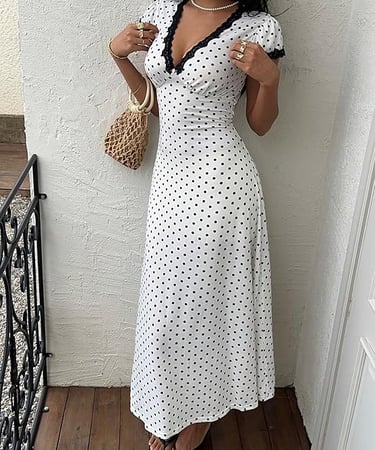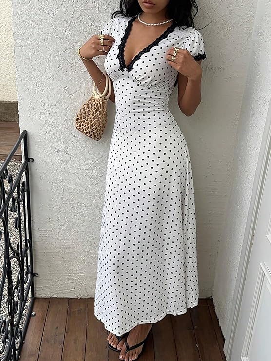 Milumia Women's Polka Dots Lace Trim Deep V Neck Dress Short Sleeve Flared