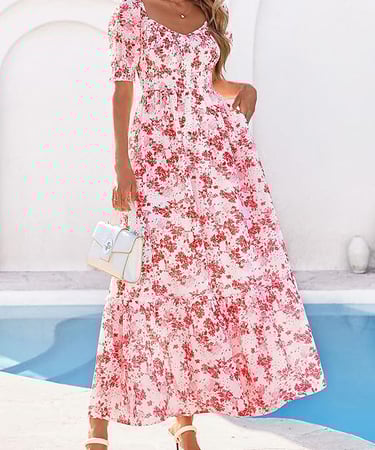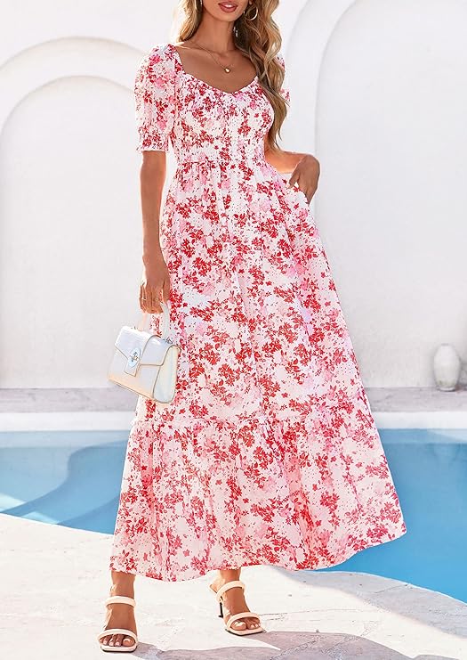 Women's Floral Boho Maxi Dresses Flowy Short Sleeve A Line Smocked Eyelet 2026 Summer Beach Vacation Clothes