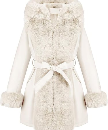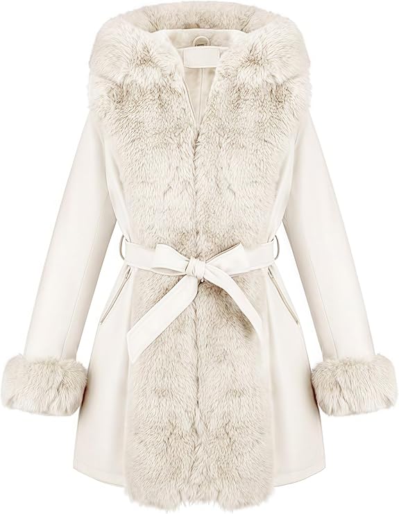 Luxurious Women Winter Fur Lined Coat, Leather Jacket with Hooded Long Fur Collar, Thick Warm Heavy Overcoat Belted