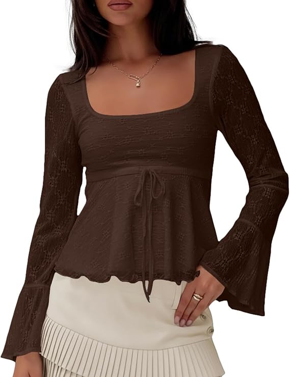 Cioatin Women Y2K Flowy Peplum Babydoll Tops Fall Outfits Long Sleeve Square Neck Sheer Floral Lace Ruffle Crop Tshirt Blouse