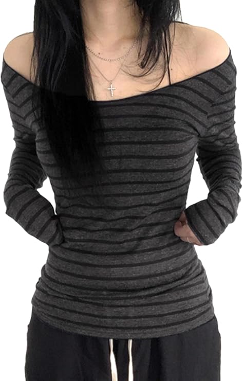 Off The Shoulder Tops for Women Striped Long Sleeve Shirts Going Out Top Y2k Fall Clothes